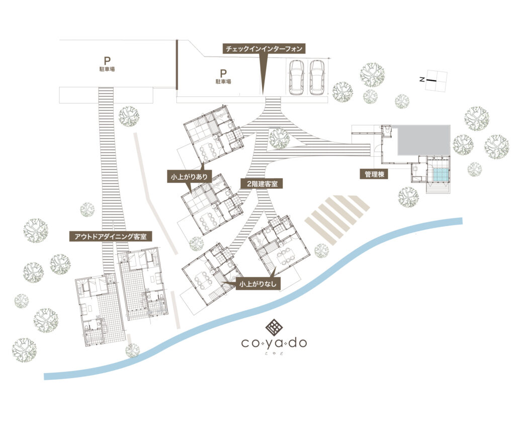 coyadoは全てのお部屋が独立した1棟タイプの客室。 2階建客室小上がりあり・なし、温泉付きアウトドアダイニング客室それぞれ2棟づつ合計6棟ございます。誰にも気兼ねすることなく、ご夫婦、家族、お子様連れ、ご友人同士と様々なお客様にご利用頂けます。※全棟禁煙です。(デッキスペースのみ喫煙可)